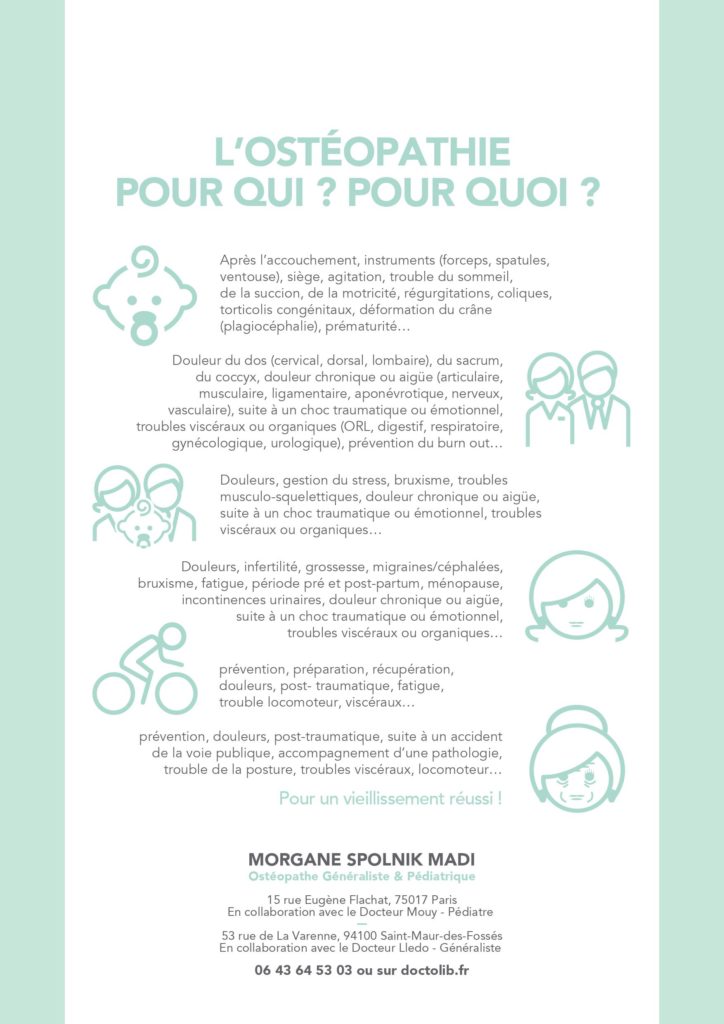 Néanmoins le champ d’application de l’Ostéopathie s’étend à d’autres troubles fonctionnels tels que viscéraux (maux de ventre, gènes respiratoires et digestives…) et crâniens (maux de tête, migraine, gênes ORL, bruxisme…).